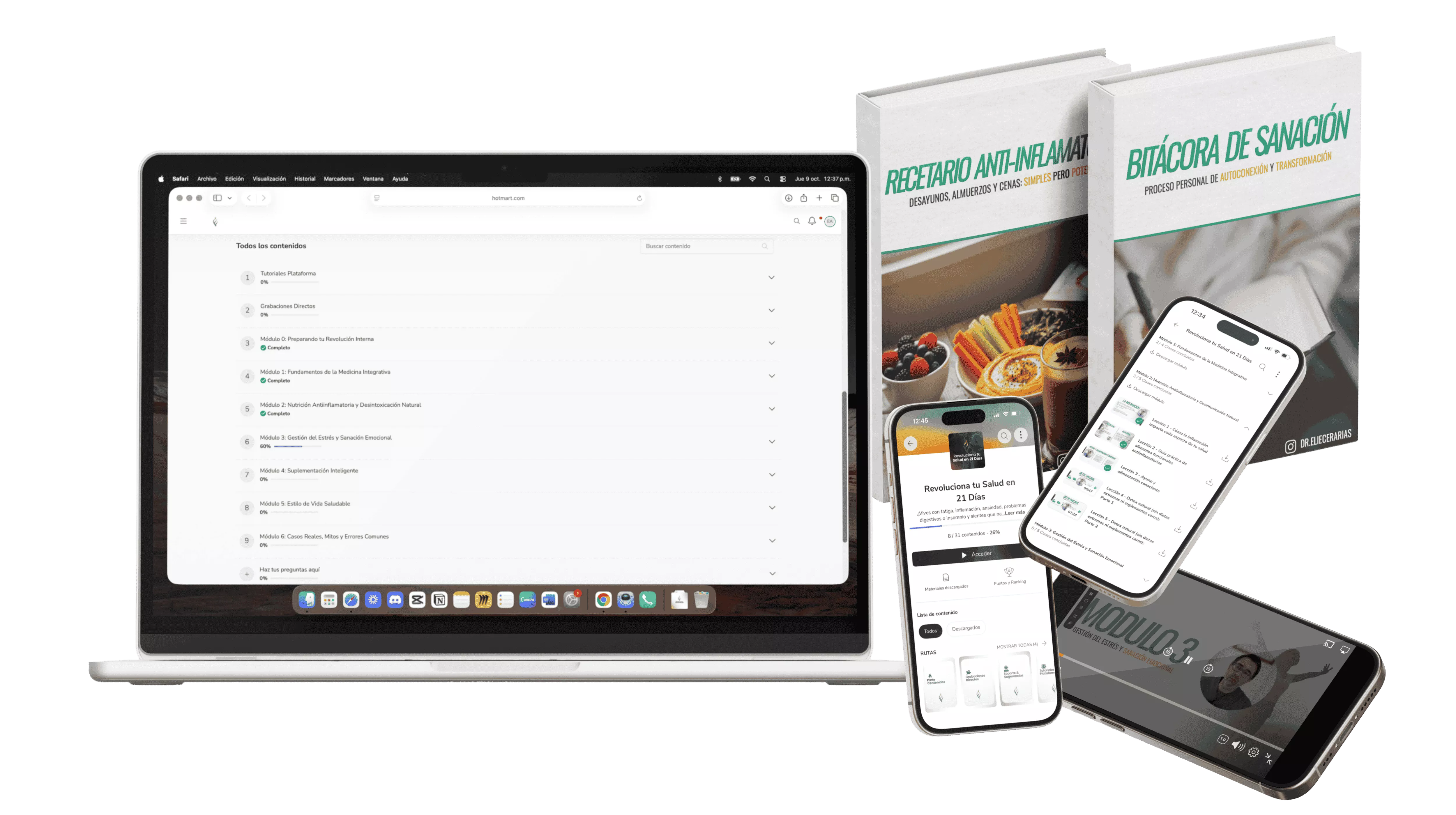 Además, contarás con recursos complementarios como la Bitácora de Sanación, el Recetario Antiinflamatorio y clases online en vivo de preguntas y respuestas, donde podrás resolver tus dudas directamente con el Dr. Arias y mantener tu motivación semana a semana.